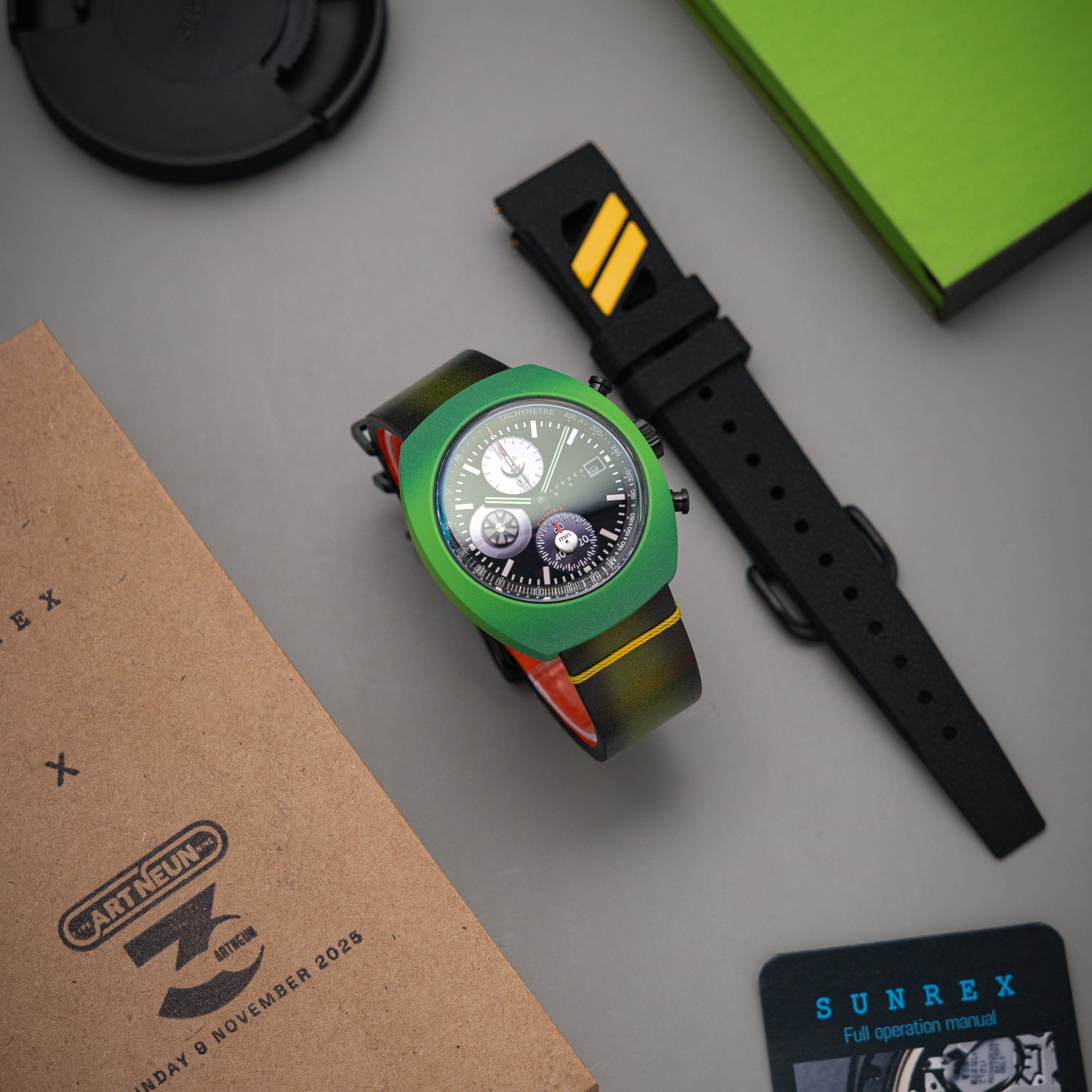 To further elevate its durability and aesthetics, the watch features a unique CERAKOTE ceramic coating — a high-performance polymer-ceramic composite that offers superior scratch and abrasion resistance (up to 9H hardness), exceptional corrosion protection and UV stability for long-lasting color vibrancy. This advanced coating not only enhances the watch’s resilience but also reflects the spirit of innovation and craftsmanship that defines both Sunrex and ArtNeun.