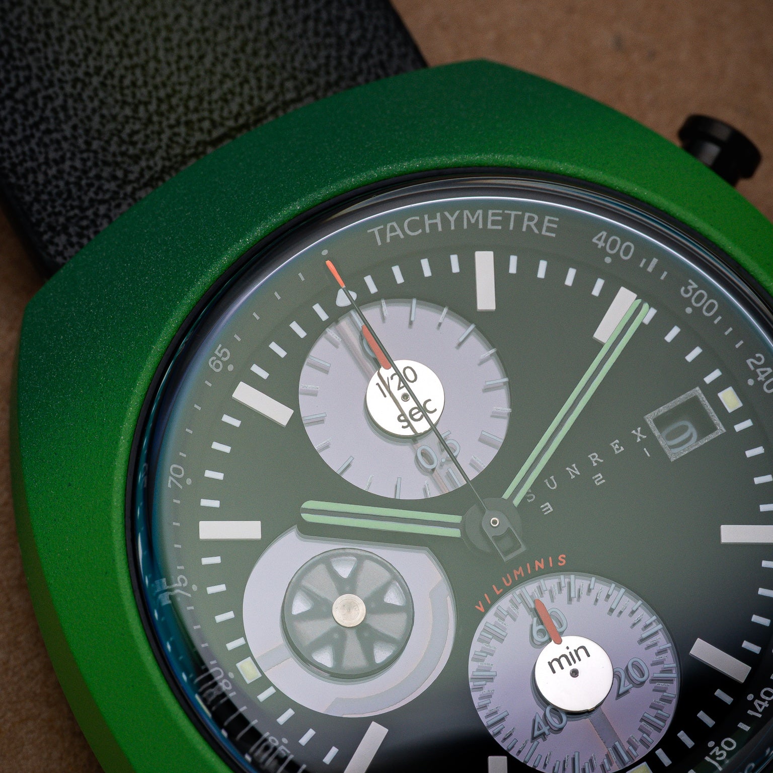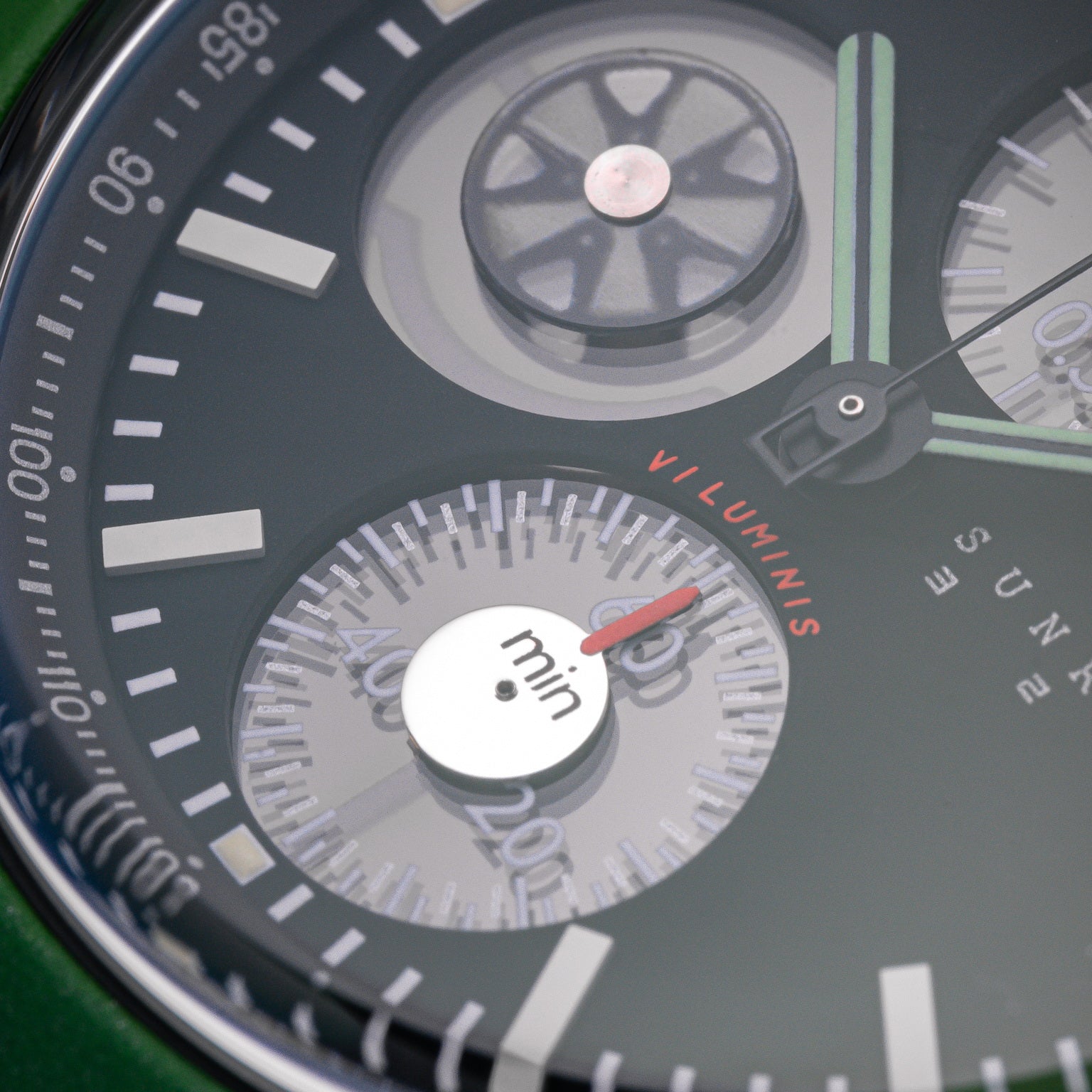 Built with a contemporary twist on traditional technology, the "321" (Artneun Edition) Racer's Chronograph uses solar-powered movements—Viluminus.