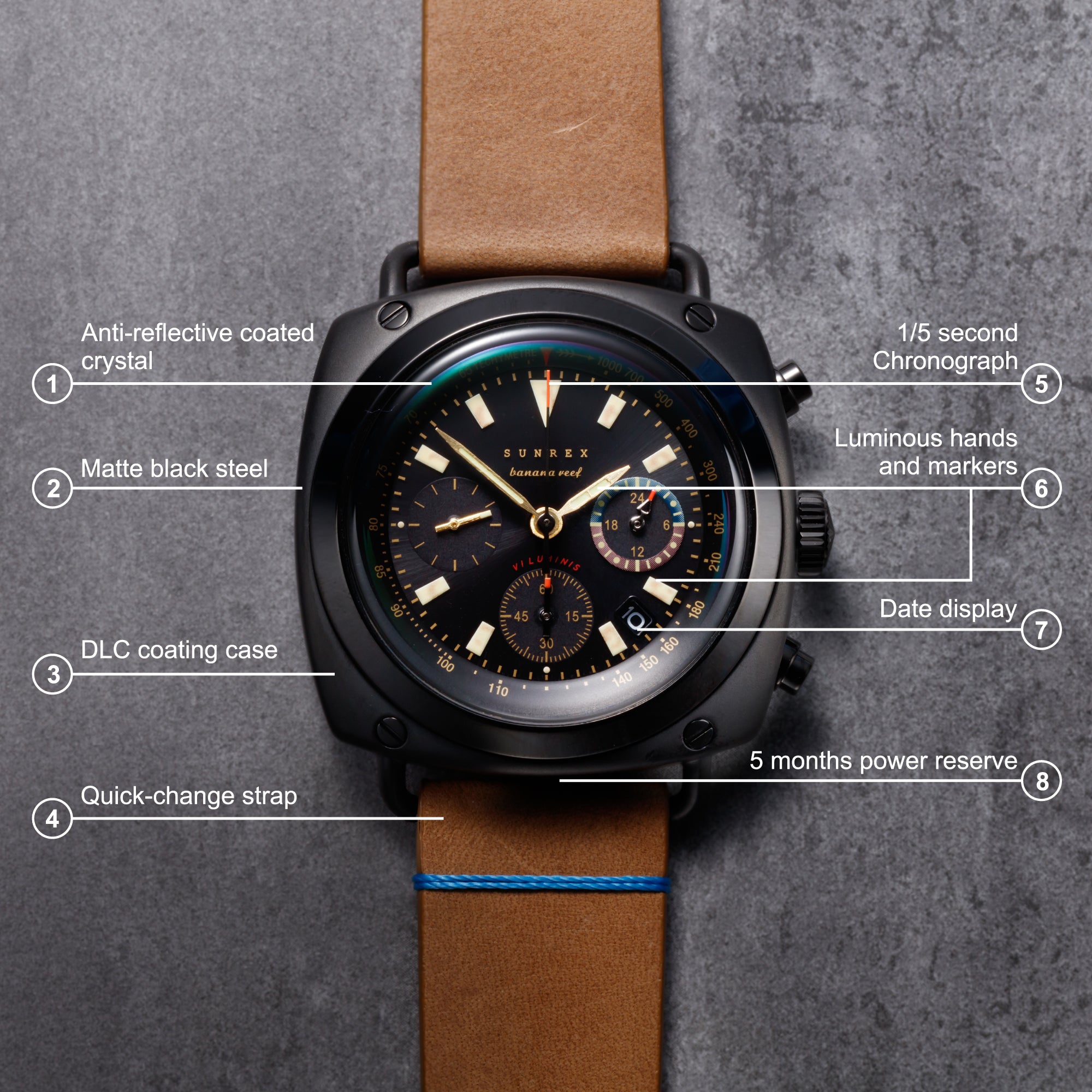 - High-hardness DLC coating and rotatable bezel with CNC-milled markings gives it superior scratch resistance and longevity.
