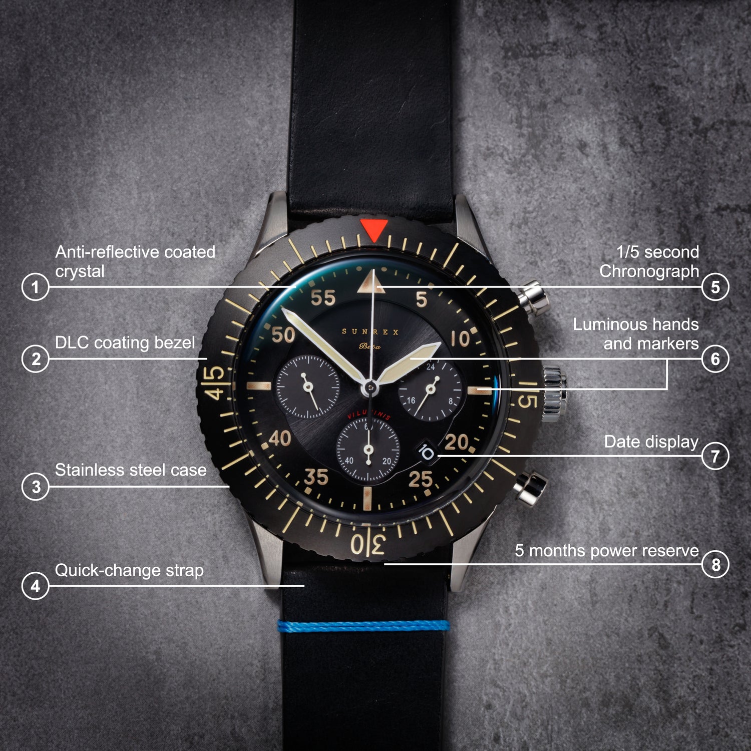 Built with a contemporary twist on traditional technology, the "Beta" Pilot's Chronograph uses solar-powered movements—Viluminus.