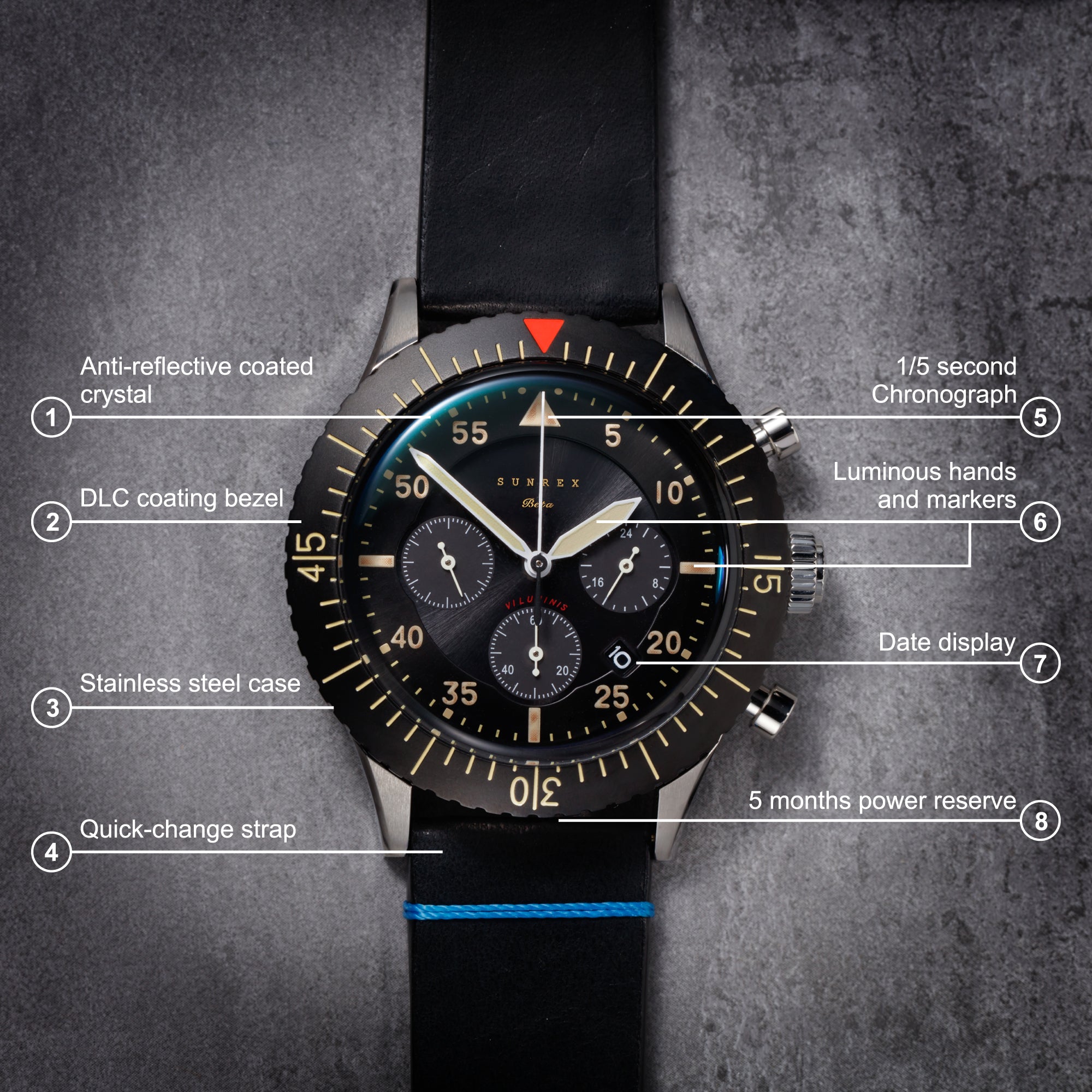 Pilot watches in the 1950s were designed as essential flight tools. Large, legible dials. Reliable movements. Bold hands that stayed visible in low-light cockpits. Rotating bezels that helped track fuel or timing at a glance. The Beta draws from those practical details, pairing them with modern solar technology and durable construction.